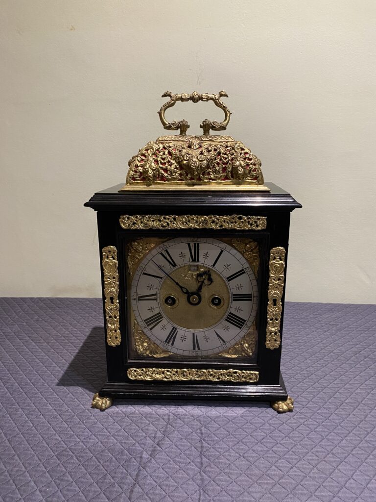 The clock shows clear stylistic influences from the great Thomas Tompion,the case of masculine form with finely detailed mouldings. the handle is identical to that of other Tompion clocks as are the escutcheons all of which are made from solid silver, together with all other mounts.